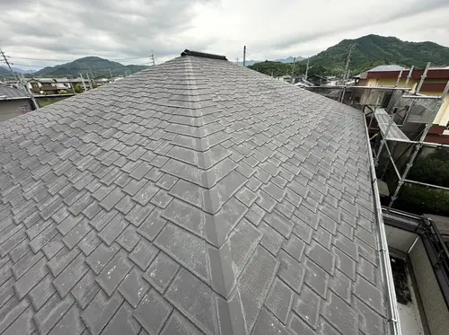 こちらのお宅の使用塗料は、関西ペイントさんのハイブリッド、無機・有機フッ素樹脂塗料「ダイナミックルーフMUKIマイルド」での塗替えを行いました!